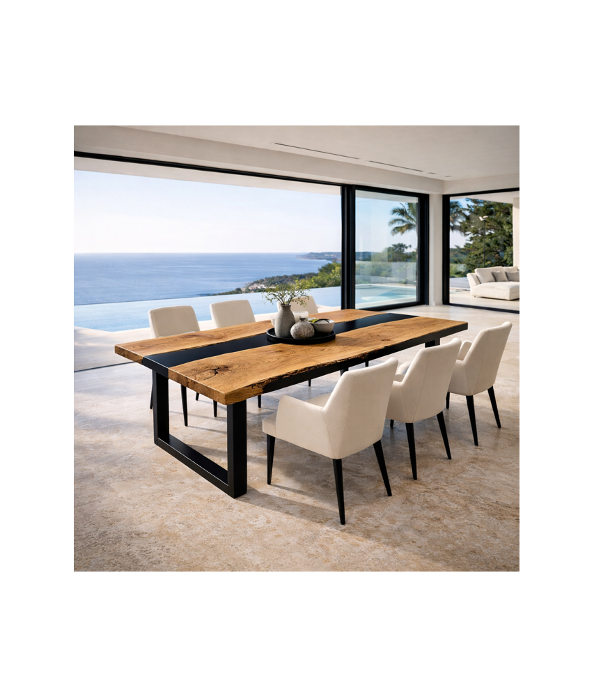The dining room is the perfect place to spend quality time with family or to entertain friends. The choice of your dining table is important and deserves careful consideration. This work will seduce you with its design that makes it a piece of furniture with a timeless style. The walnut wood, renowned for its longevity and appreciated in architecture, ensures to this table a solidity and quality and gives it a beautiful brightness and an original charm. This true work of art is associated with a mikado foot finished in matt black have been merged for a unique design rendering with its 2 rivers poured between 3 solid planks of walnut wood.