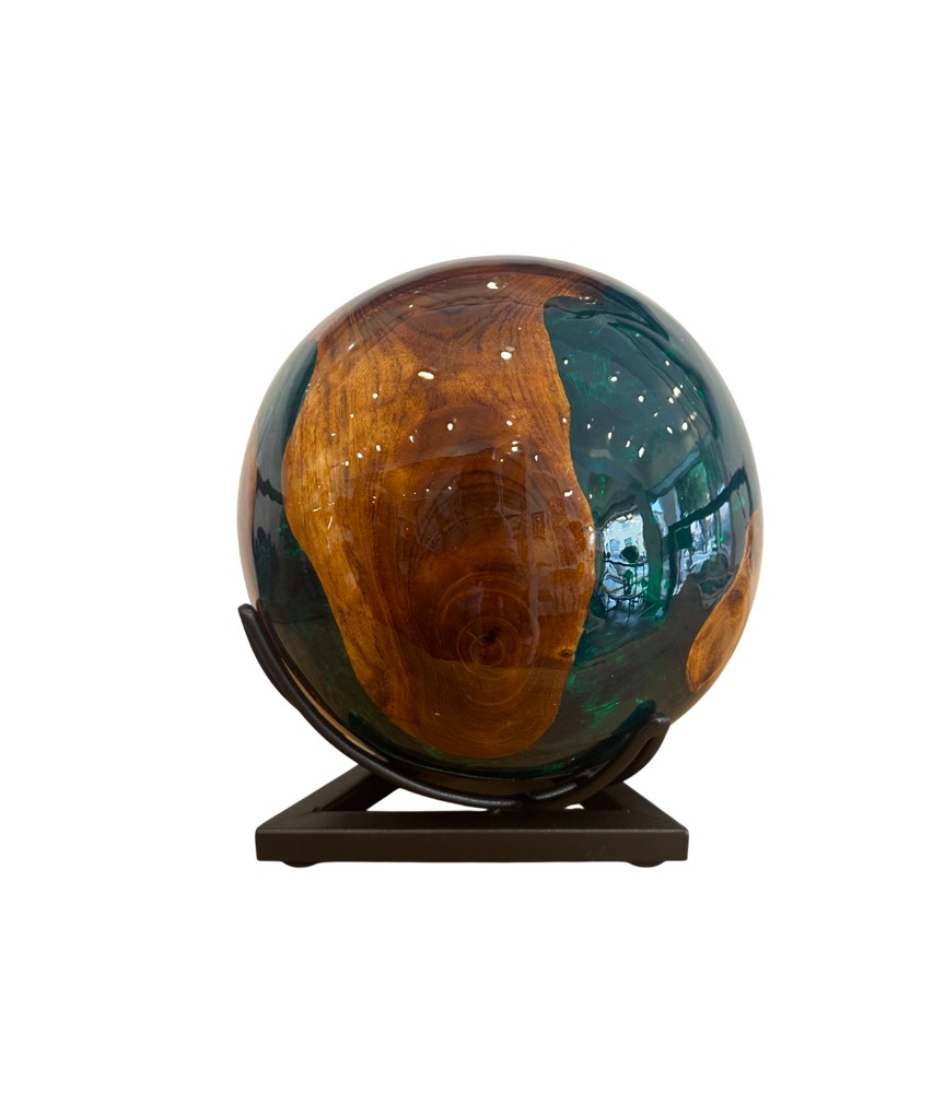 Esfera escultórica en resina epoxi verde transparente y vidrio – Modelo mediano