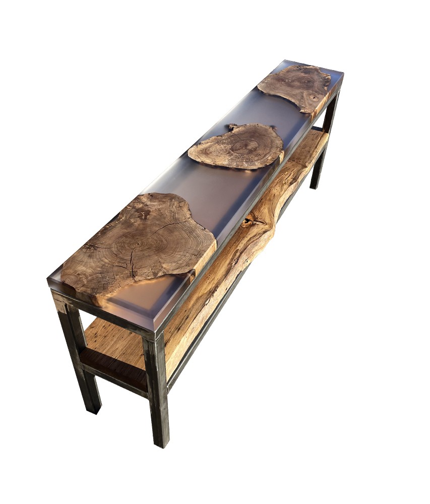 Esta consola de la "Gama Design" fue hecha por el artista TEY. Está hecha de resina mezclada con madera de nogal macizo. La resina transparente aporta profundidad y elegancia a este logro.
