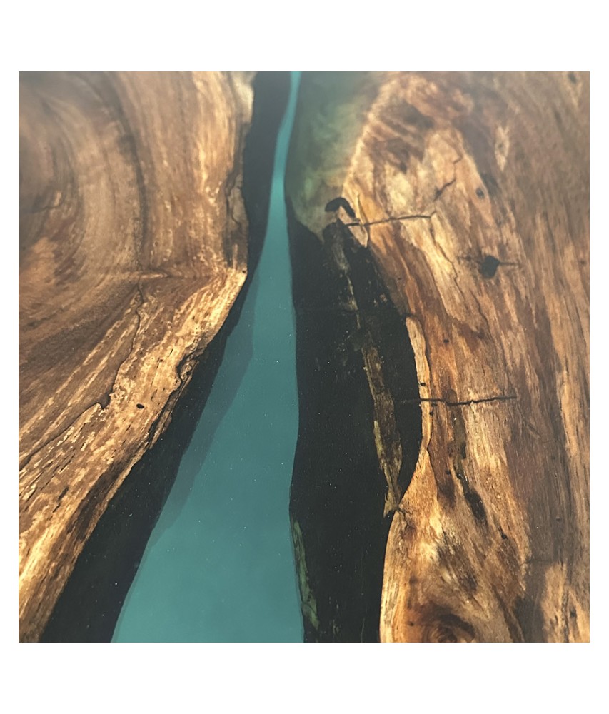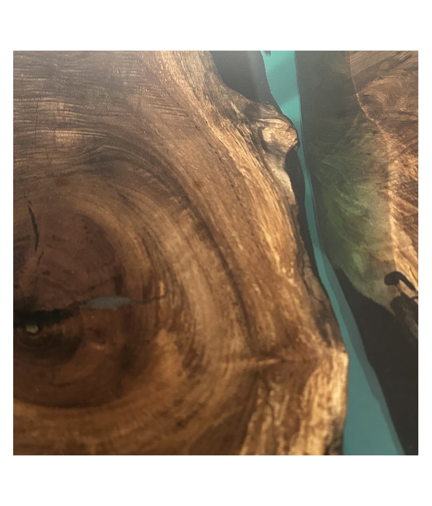 El nogal macizo se combina con resina epoxi turquesa totalmente transparente, generando una profundidad visual excepcional. El acabado ultra brillante en ambas caras maximiza la reflexión de la luz.