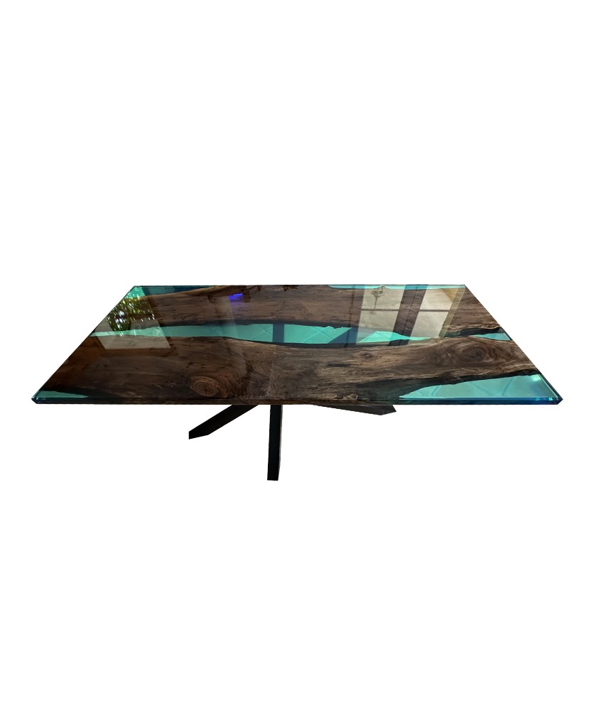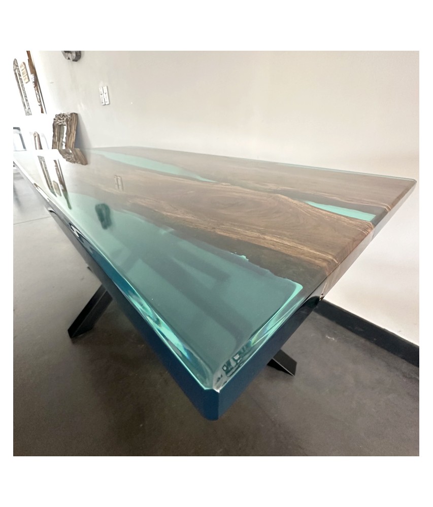 Mesa de comedor en nogal macizo y resina epoxi turquesa transparente, firmada por Tey – World’s Art. Pieza única con acabado ultra brillante en ambas caras, borde biselado plano y base Mikado negra mate termolacada.