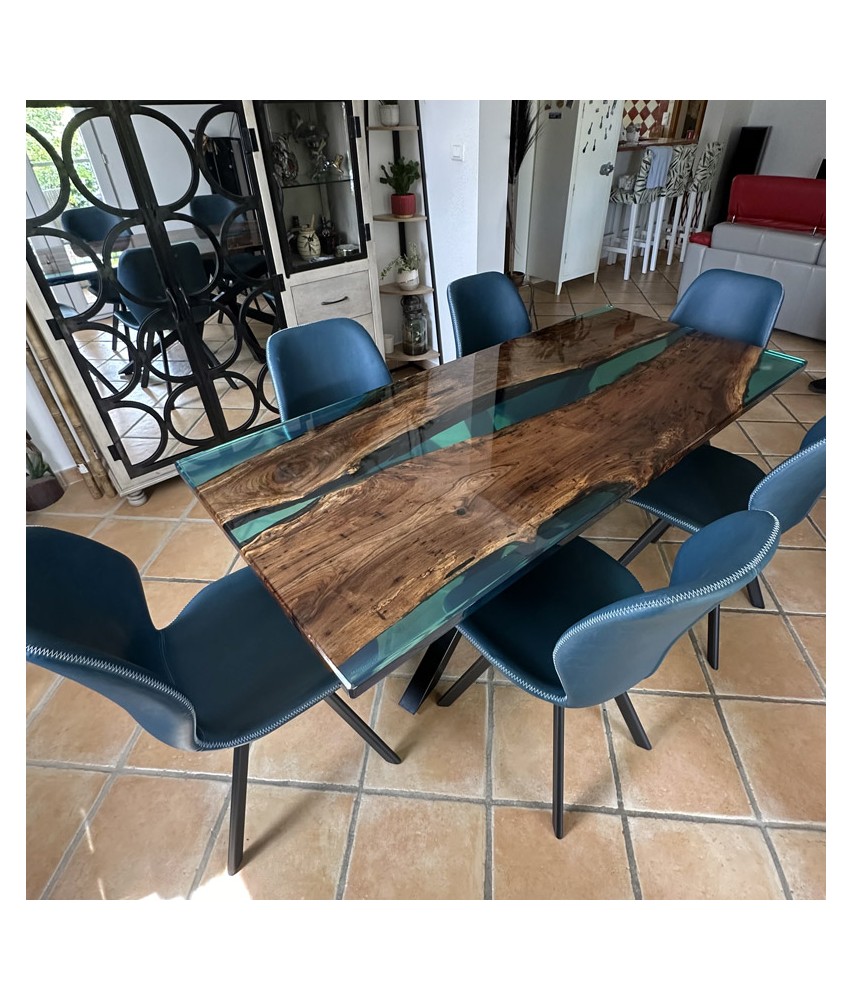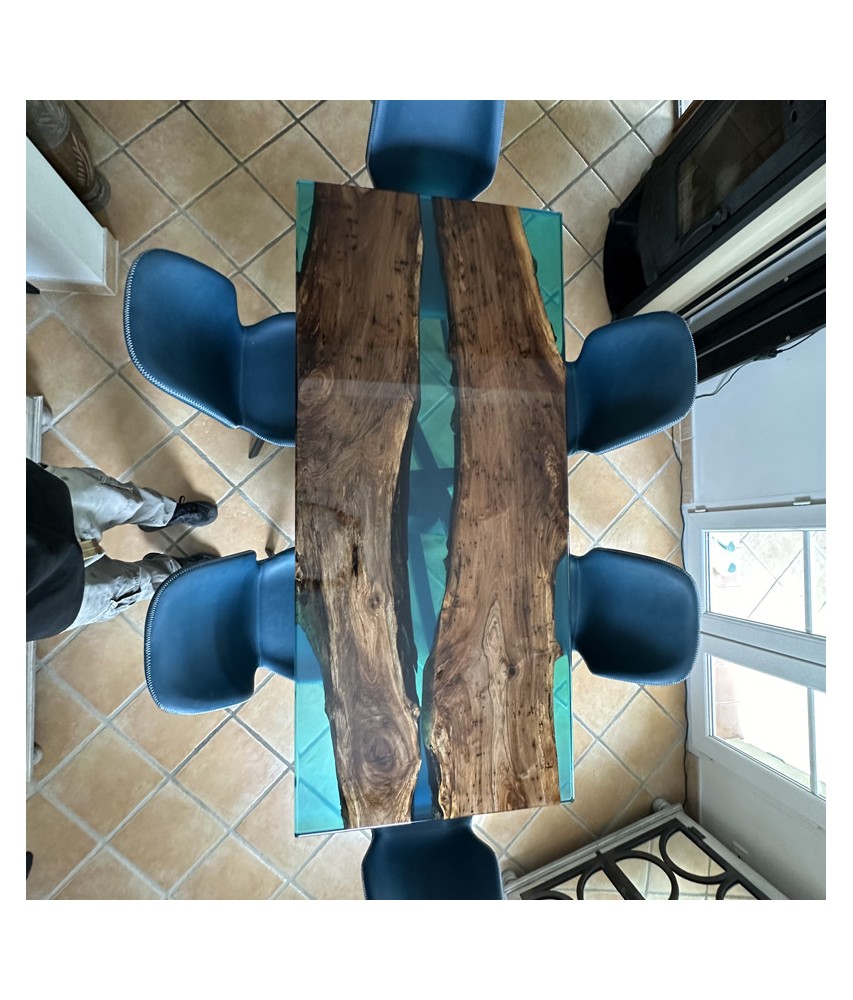 Esta mesa de comedor en nogal y resina epoxi turquesa transparente es una creación única firmada por Tey – World’s Art.