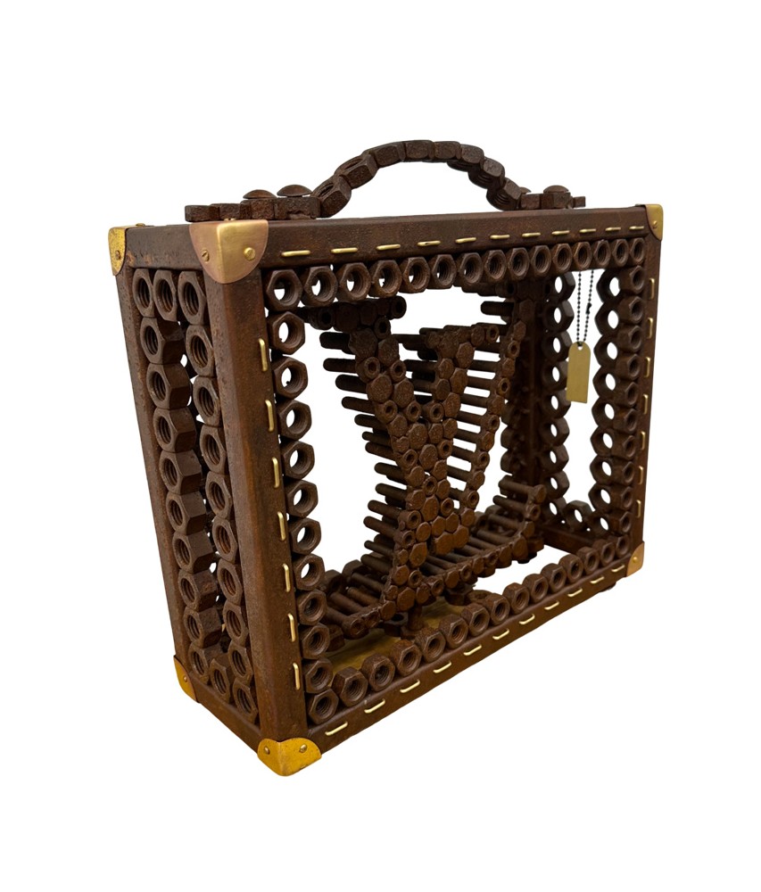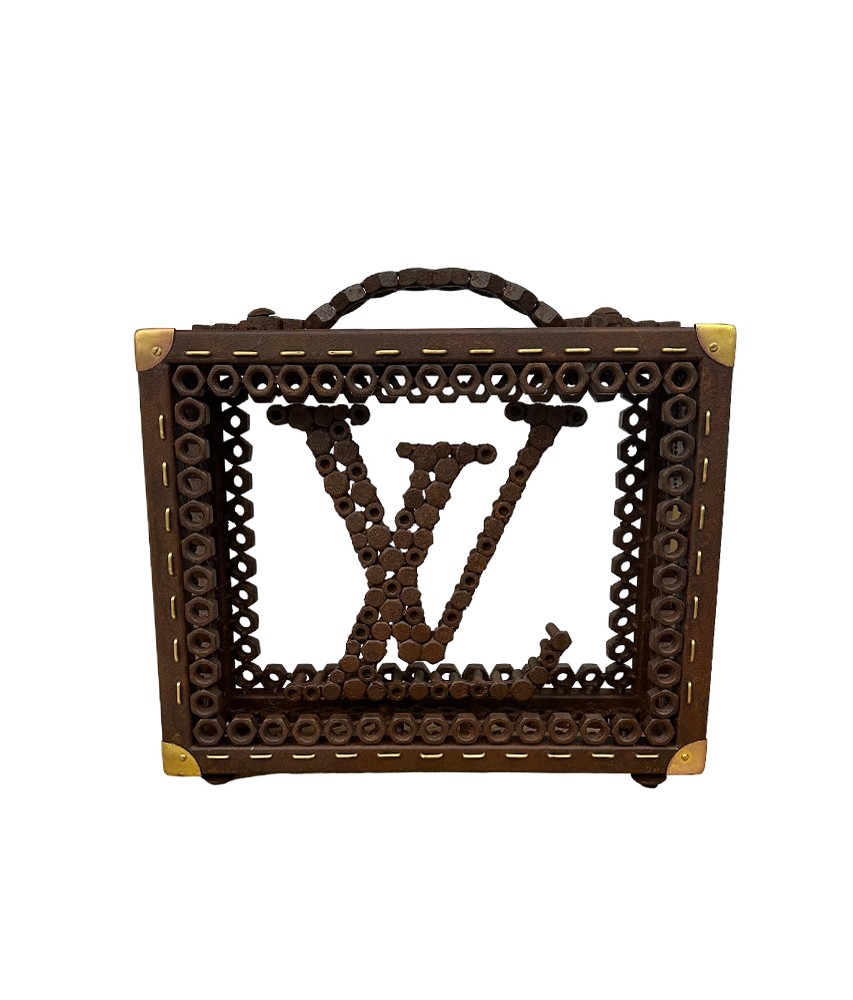 Una obra poderosa que mezcla el acero oxidado con efectos dorados para reinterpretar símbolos legendarios asociados al lujo y la alta costura. Las formas están construidas a mano mediante la unión de tornillos y elementos metálicos.