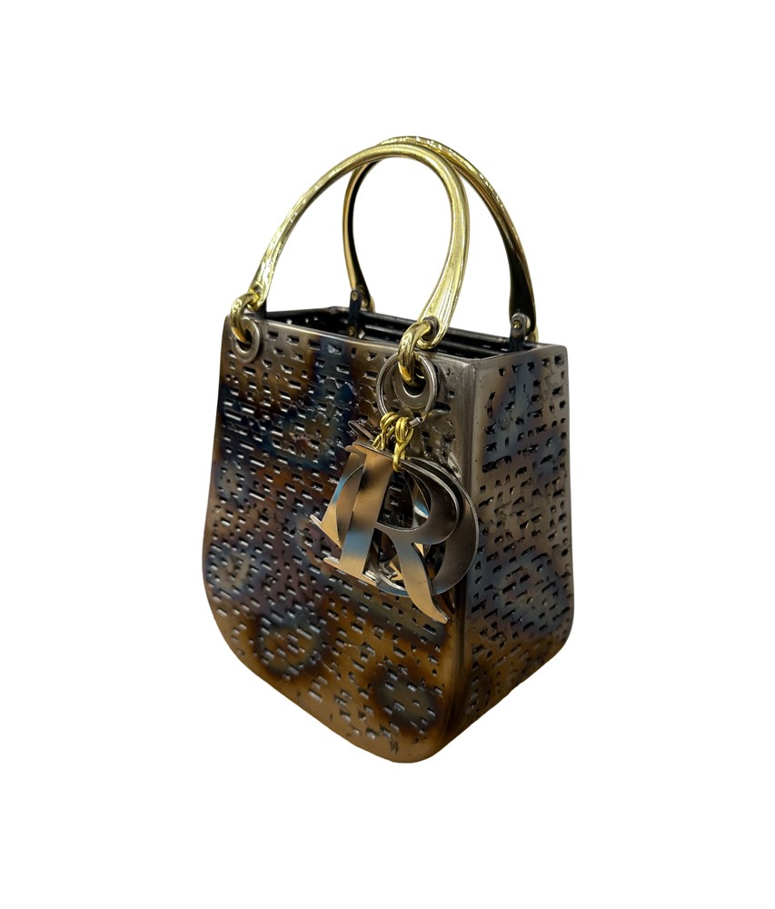 Esta escultura contemporánea en metal representa una interpretación artística de un bolso icónico, realizada y firmada por el artista francés La Patte du Métal. El acabado dorado y los detalles perforados crean una pieza moderna, refinada y visualmente impactante.