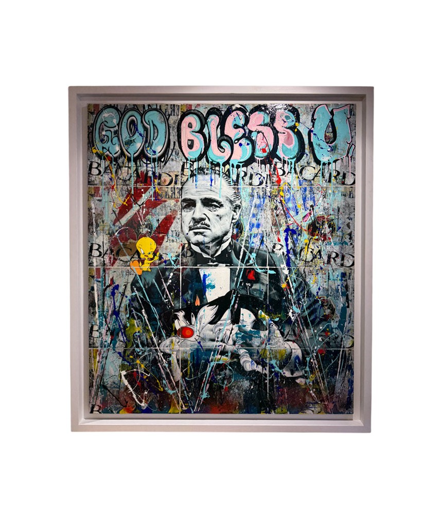 « God Bless Power » es una obra impactante creada por el artista italiano SKIRI, que fusiona cultura cinematográfica y arte urbano contemporáneo. La composición presenta una figura icónica símbolo universal de fuerza, liderazgo y respeto.