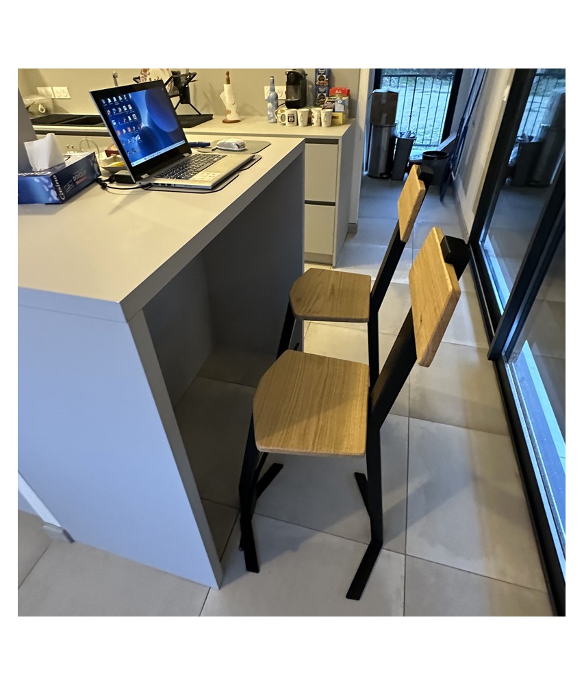 Este taburete mide 35 x 30 cm de lado y tiene una altura de asiento de 65 cm y una altura de 110 cm. La parte de madera y resina de la carpeta mide 35 x 15 cm en el lateral. La bandeja y el peso total de esta creación es de 11,9kg.