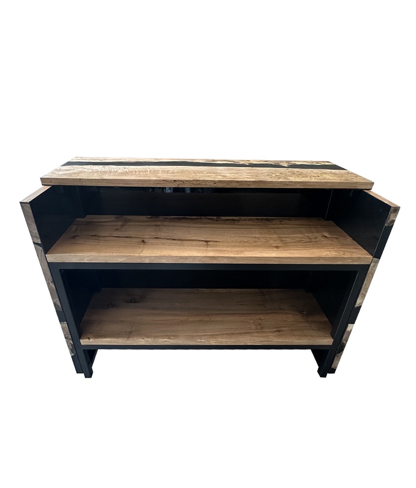 Matériaux : noyer massif & résine époxy noire effet lac, structure en métal finition noire thermolaquée.