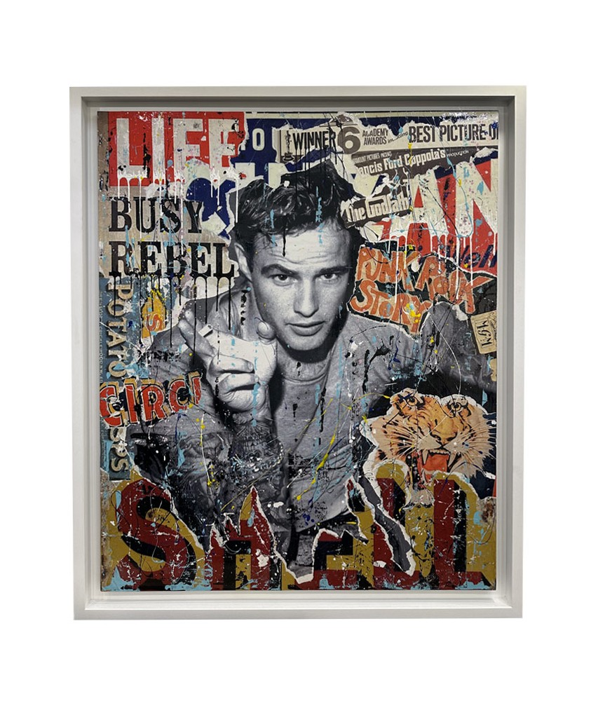 Construit à partir de collages de textures, d’acrylique, de spray et de dripping, ce tableau crée une atmosphère vibrante et intense. La composition met en scène une icône intemporelle du cinéma classique, symbole de force, de liberté et d’attitude provocatrice, au cœur d’un univers urbain déstructuré et explosif.