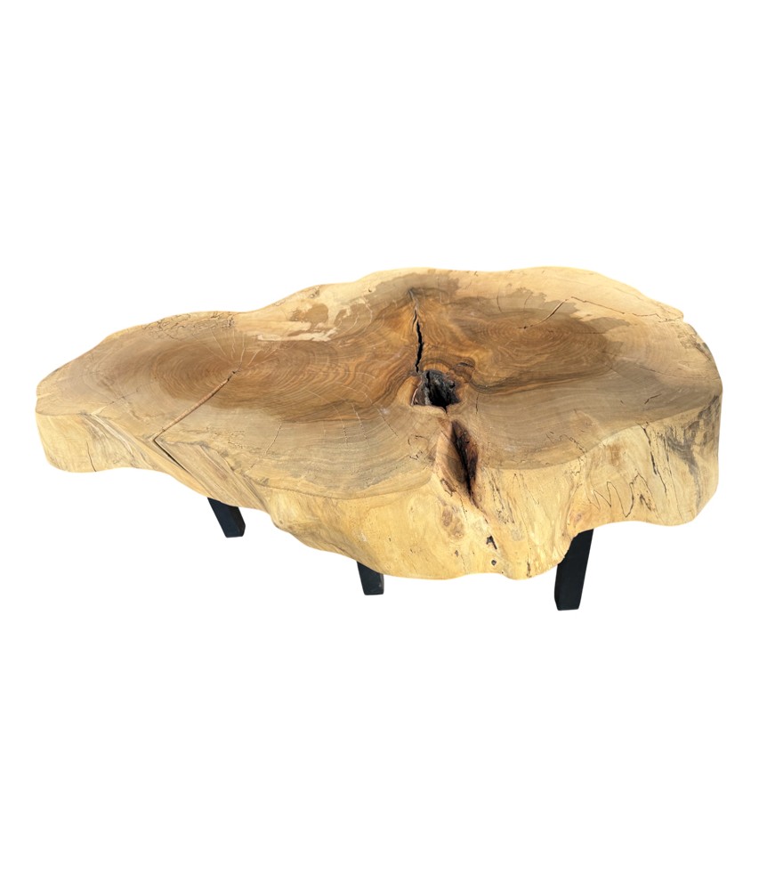 Table basse en racine de noyer massif issue d’un double tronc en Provence, création signée Tey – World’s Art. Pièce irrégulière aux lignes organiques, protégée par une huile haut de gamme OXMO et montée sur pieds métal noir mat.