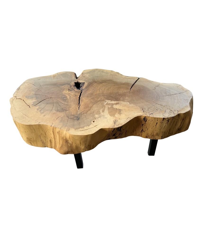 Cette table basse en racine de noyer massif est née d’un double tronc provenant de Provence. Sa forme naturellement irrégulière raconte l’histoire du bois et révèle une présence brute et sculpturale.