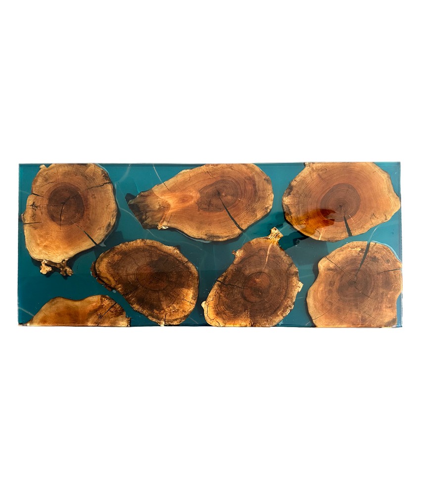 - Bois naturel, résine turquoise et pieds finition noire mat