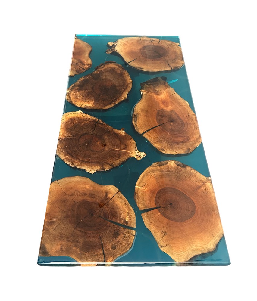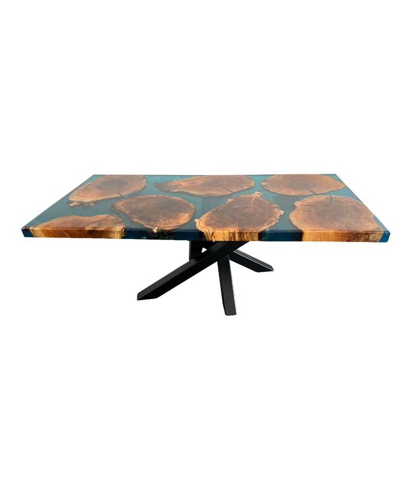Cette table basse ultra-moderne et atypique est pleine de charme et fera de l’œil à vos invités. Cette création est une véritable oeuvre d'art qui a été faite en bout de bois de noyer et résine époxy turquoise afin de donner un style contemporain à votre décoration. Le pied de cette table basse est un pied style mikado design.